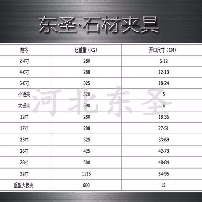 舉例說明:我公司生產(chǎn)小規(guī)格高強度石材板夾產(chǎn)品型號為4寸,開口尺寸為小###6厘米,大###12厘米,其所能夾起的重量是325kg。